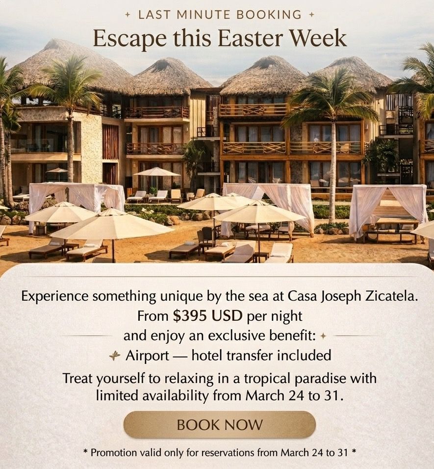 Apply promo code FEB20% when booking directly on our website and receive 20% off your stay at Casa Joseph Zicatela. Valid only from February 16 to 20 and 25 to 28 on all room types.